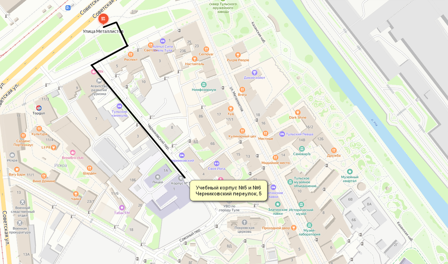Расстояние до учебных корпусов №5,6, расположенного по адресу г. Тула, Черниковский переулок, д. 5, от остановки общественного транспорта (троллейбус №№2,4,6,7, автобус №№ 1, 8, 11, 11а, 24, 25, 27а, 32л, 34, 36, 44, 114к) составляет 252 м.