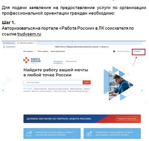 Заполнение заявки на профессиональную ориентацию необходимо начать с регистрации на платформе «Работа в России» по ссылке: https://trudvsem.ru/