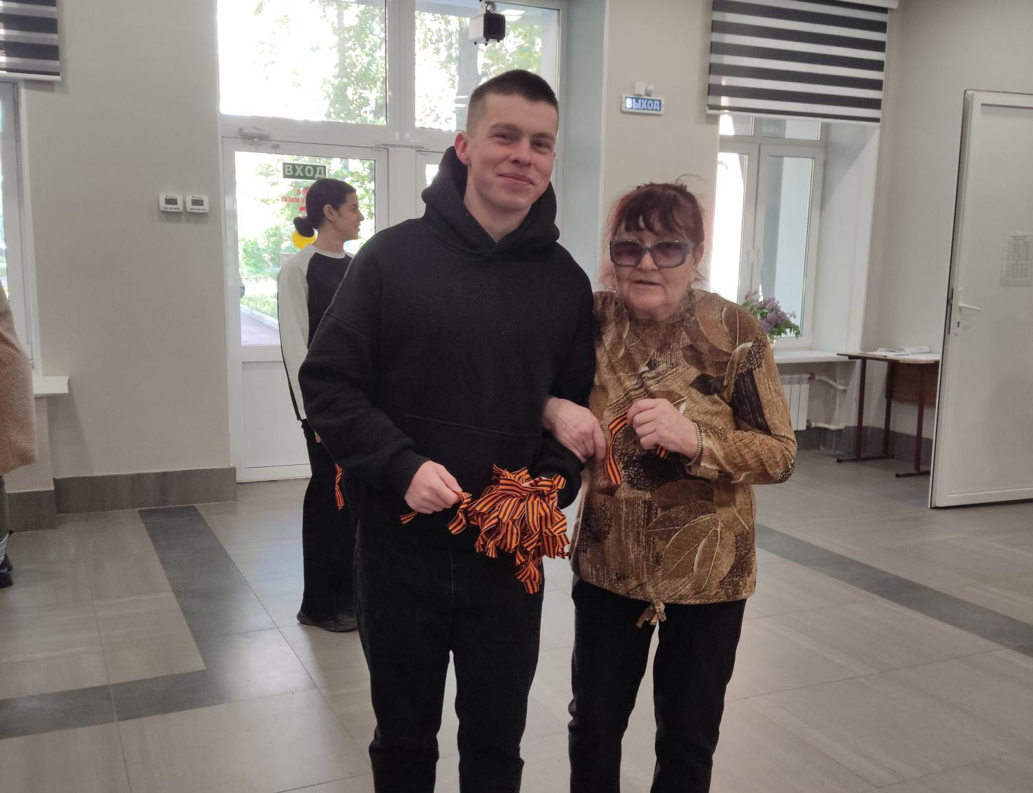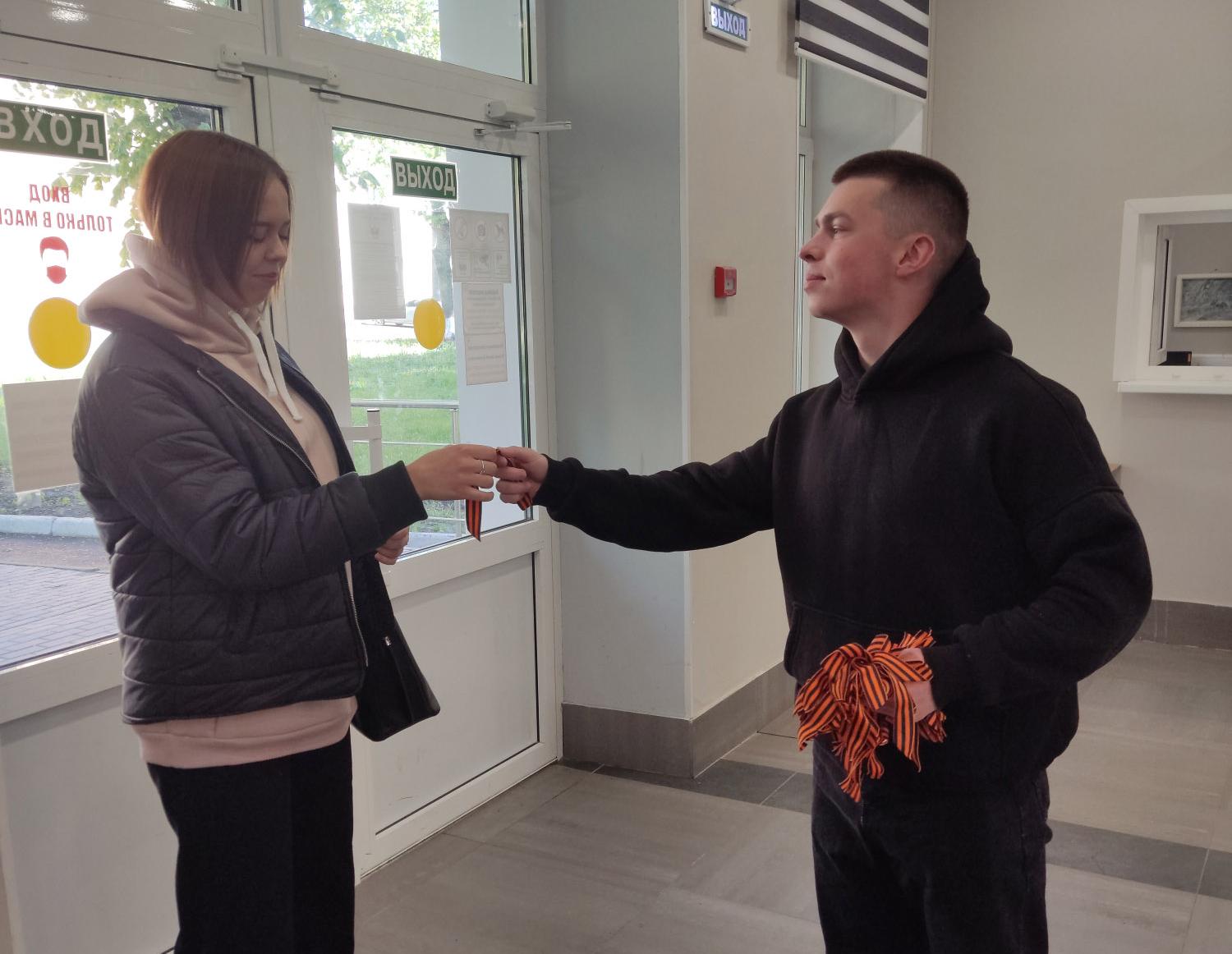 Утром, во всех учебных корпусах университета добровольцы организовали раздачу Георгиевских лент преподавателям, сотрудникам и студентам.