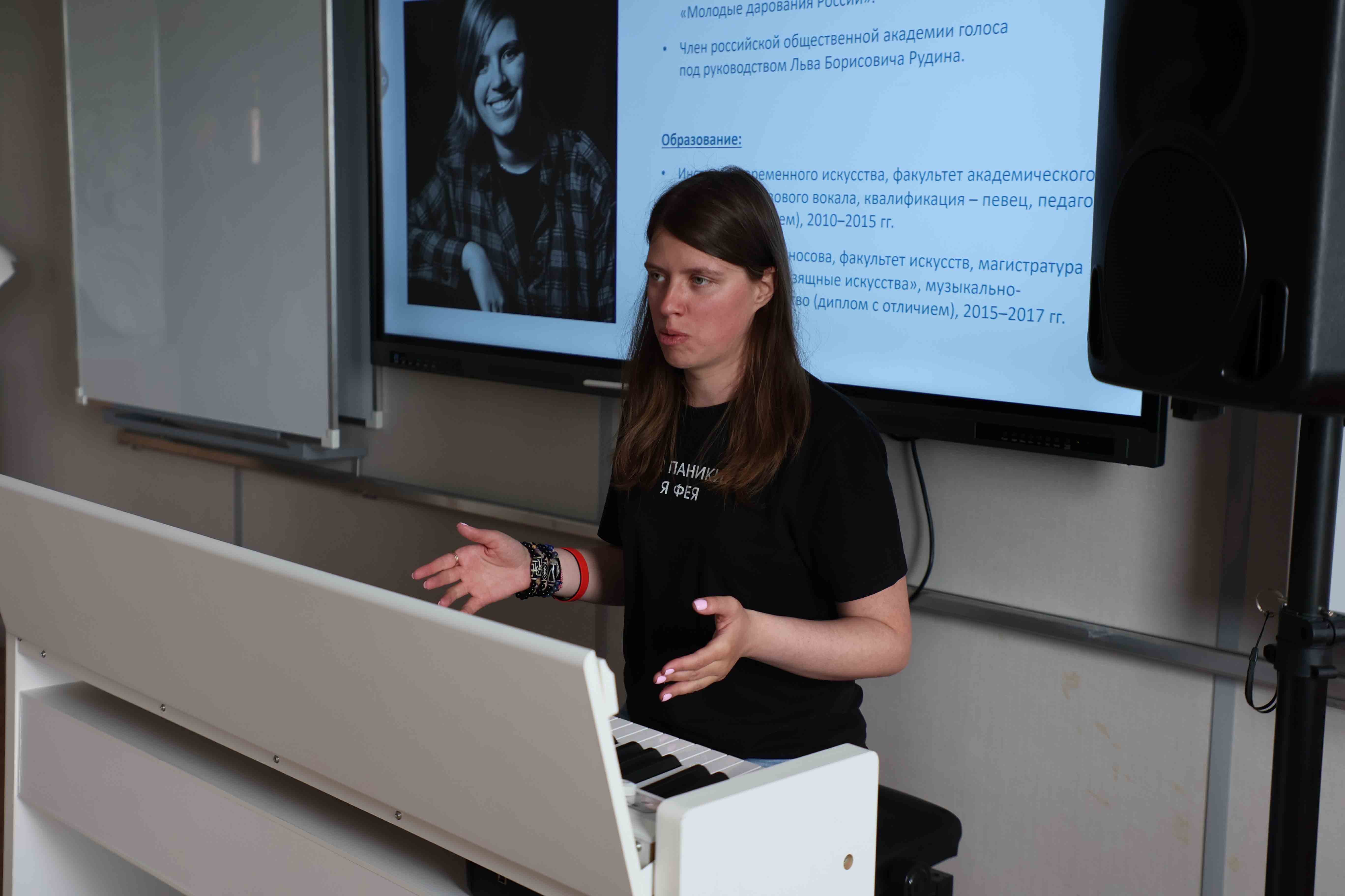 Мария поделилась практическими приёмами работы с вокалистами, представила свою методику сочинения музыки и помогла студентам написать куплет новой песни.