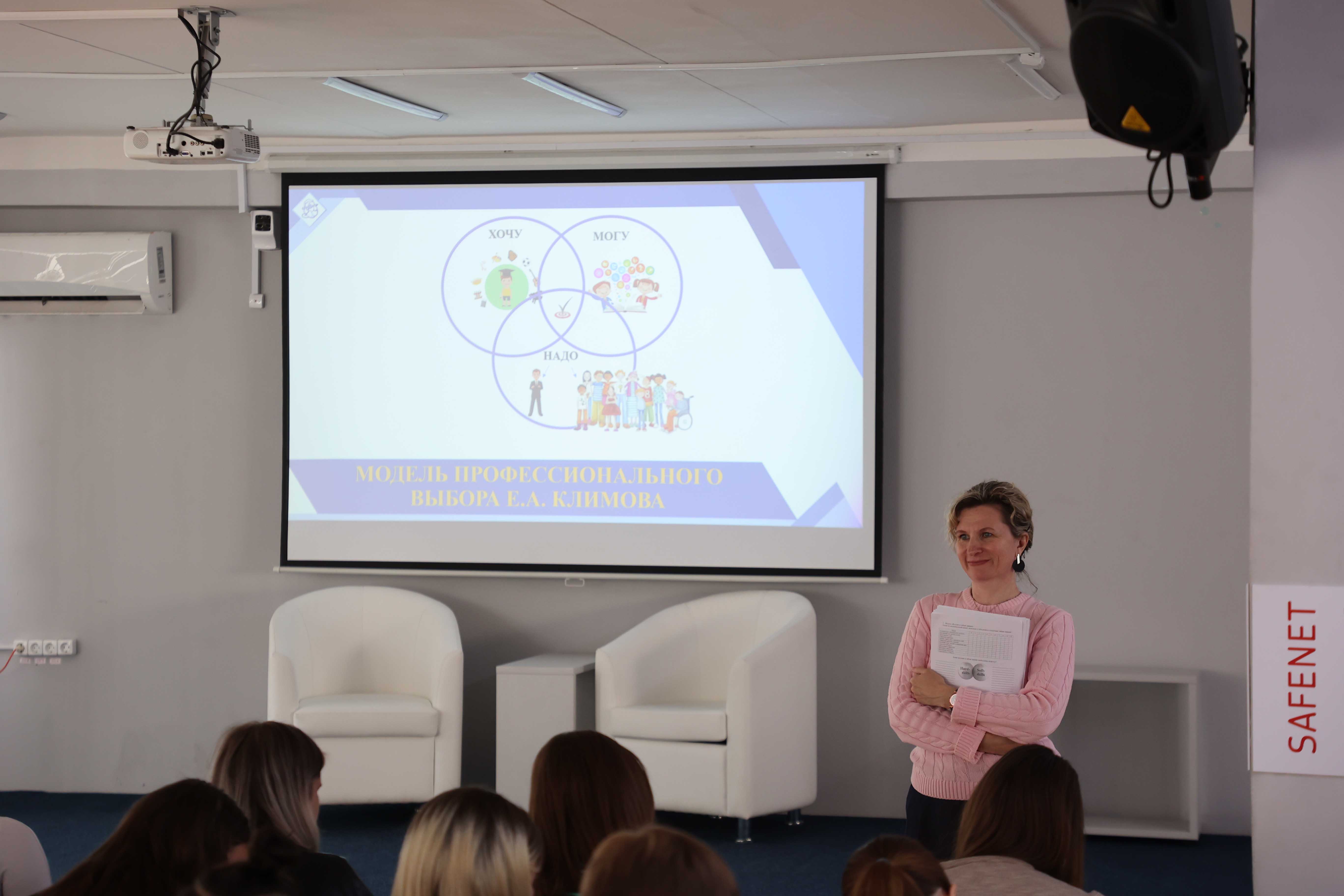 Образовательная программа второго дня работы «Методического лектория» от педагогов гимназии №56 (Санкт-Петербург) началась с интерактивной лекции на тему «Будущее в настоящем: федеральные и региональные проекты профессионального самоопределения школьников».
