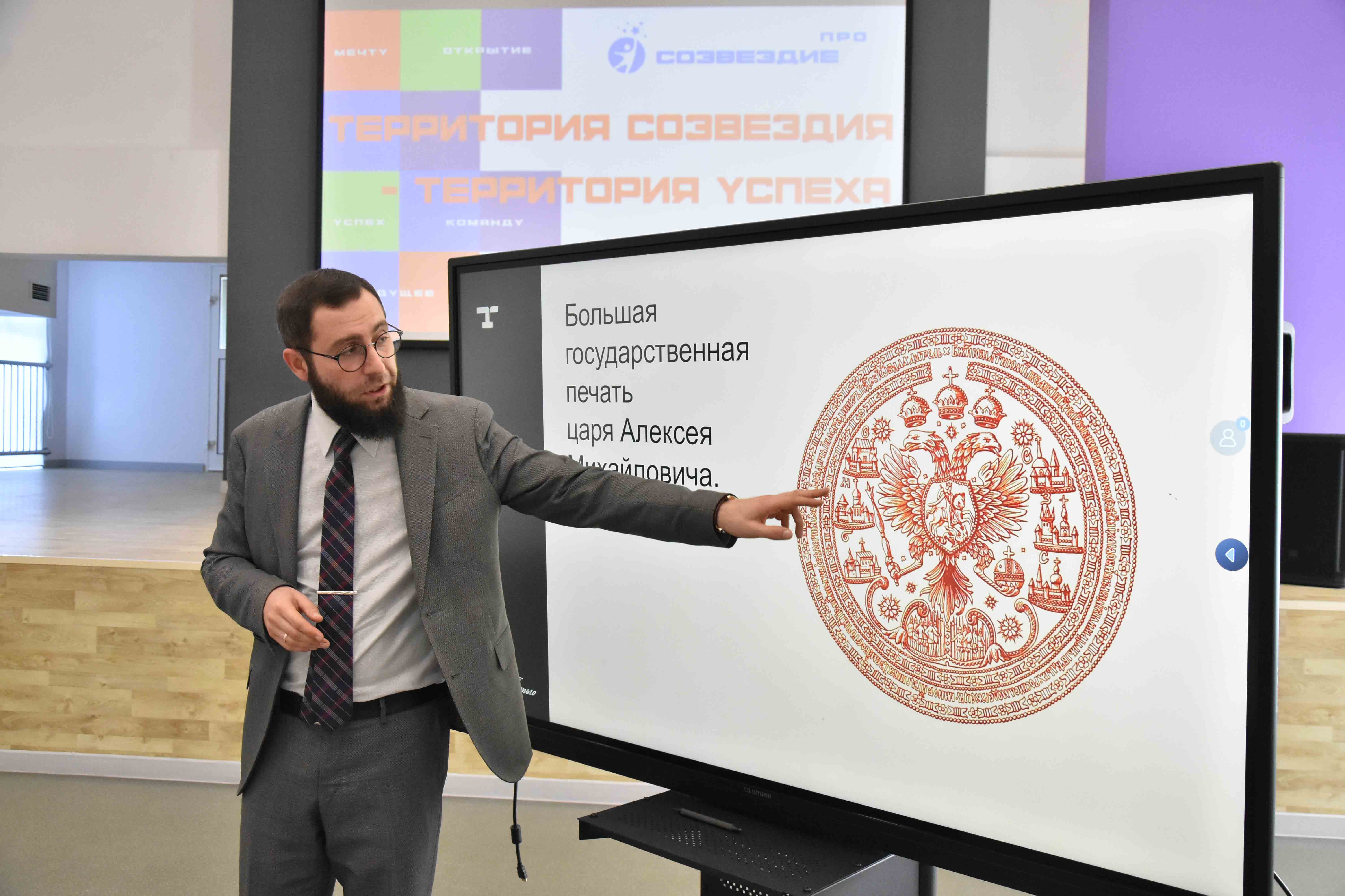 Университет Льва Толстого организовал для «академиков» день увлекательного погружения в историю. Об истории государственных символов им рассказал Никита Биленко, кандидат исторических наук, заведующий кафедрой истории и археологии.