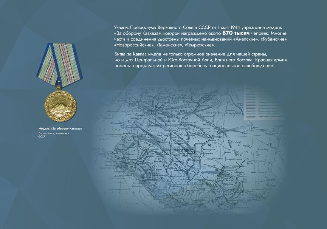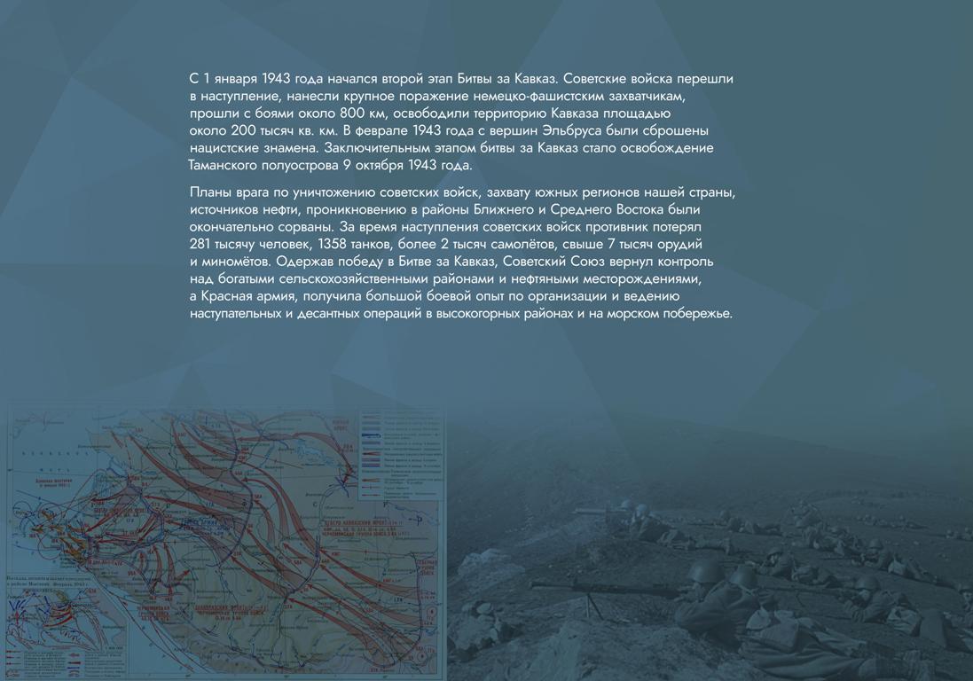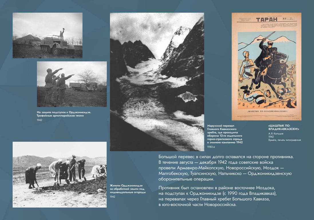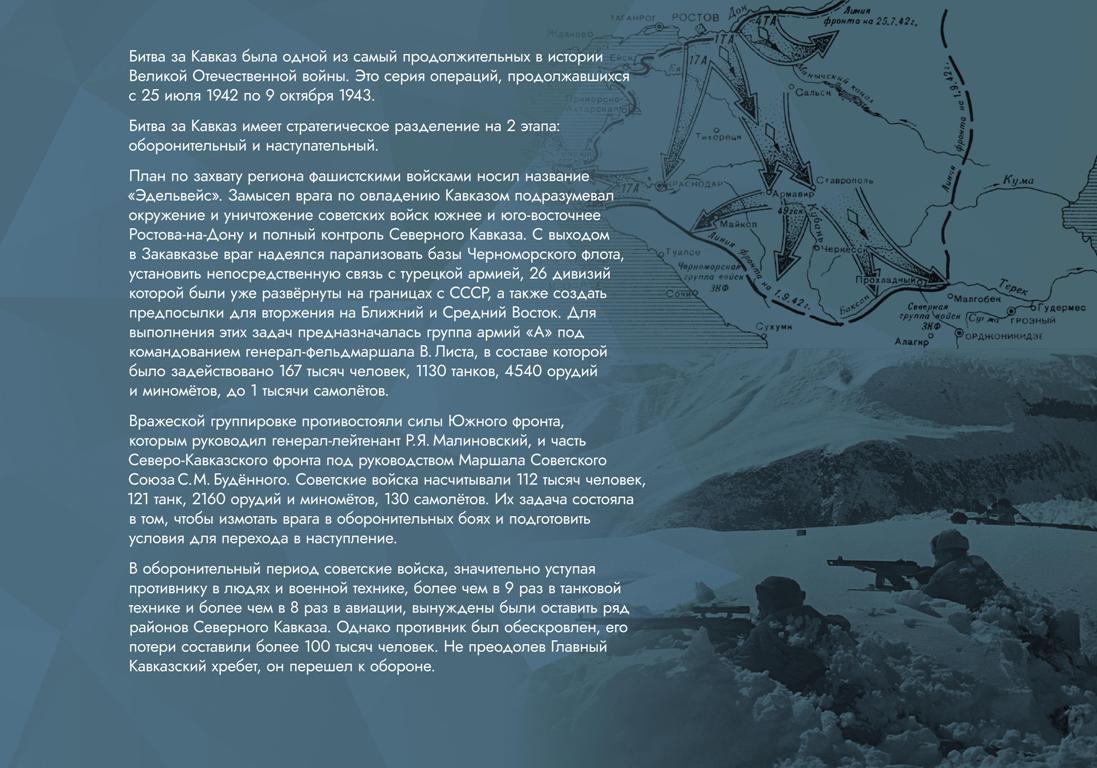 Выставка создана на основе фондовых экспонатов Музея Победы и рассказывает об одной из самых продолжительных и масштабных в истории Великой Отечественной войны битве за Кавказ с 25 июля 1942 по 9 октября 1943.