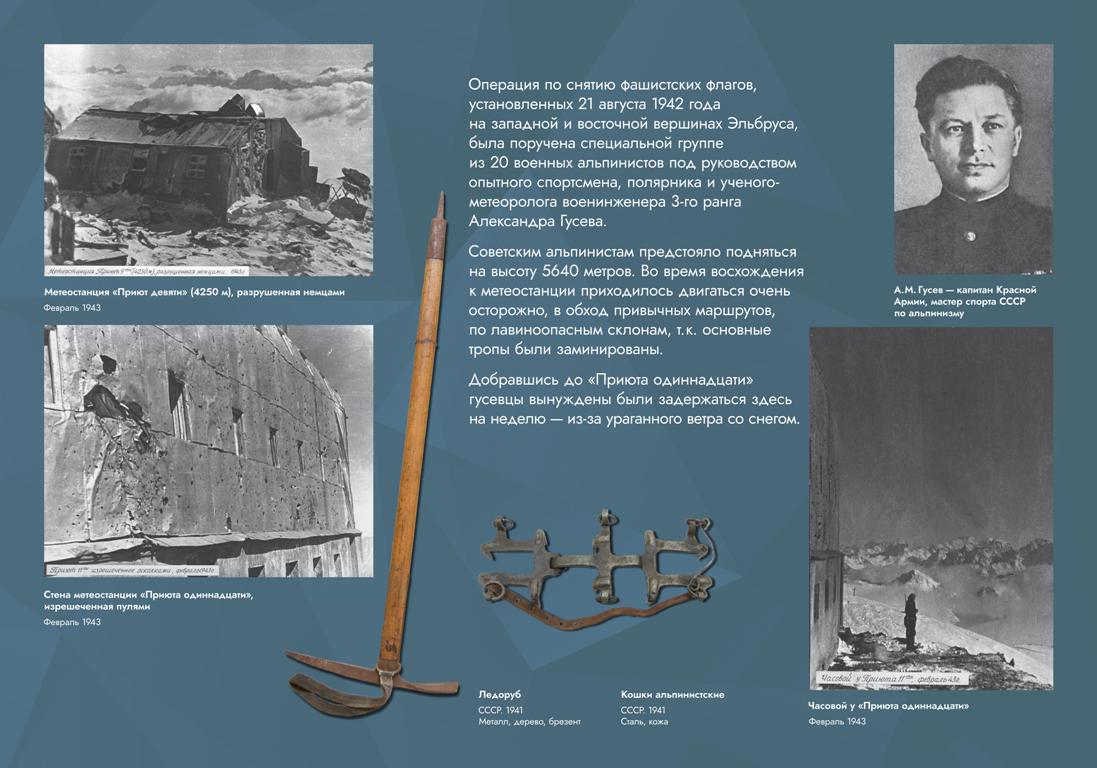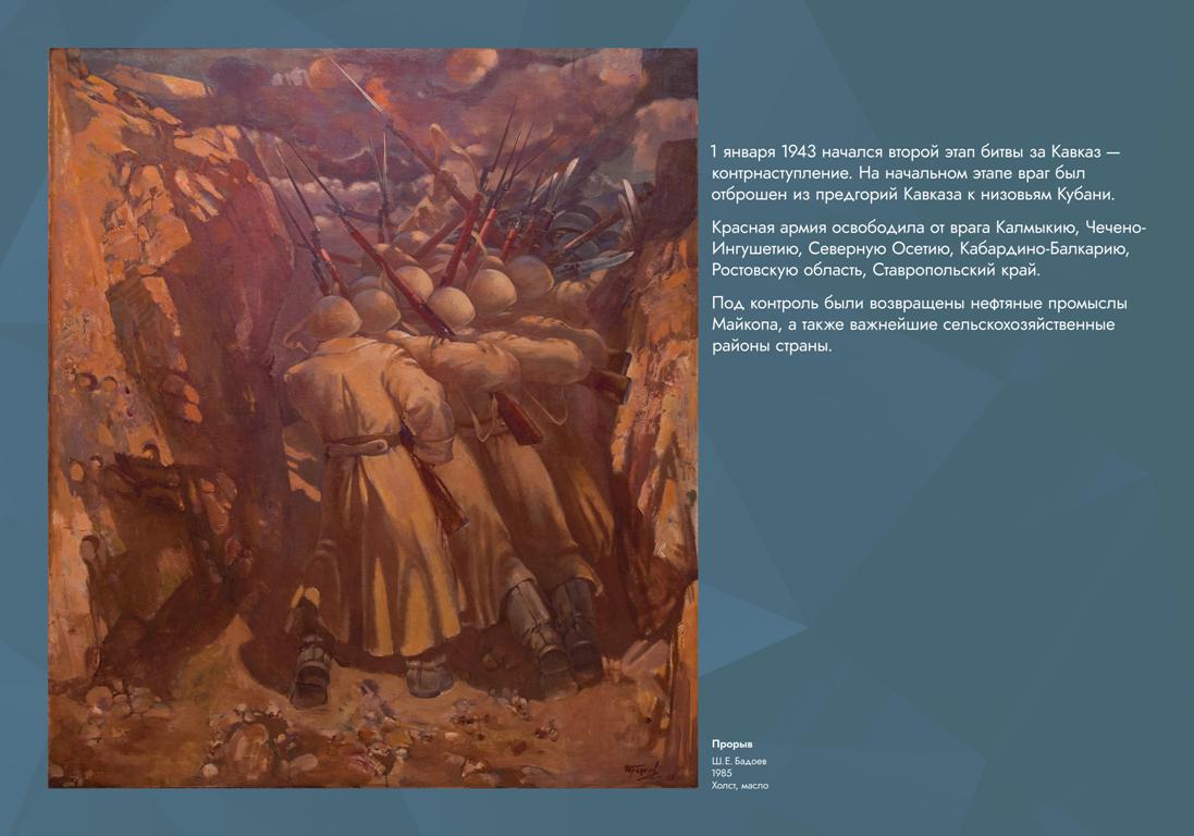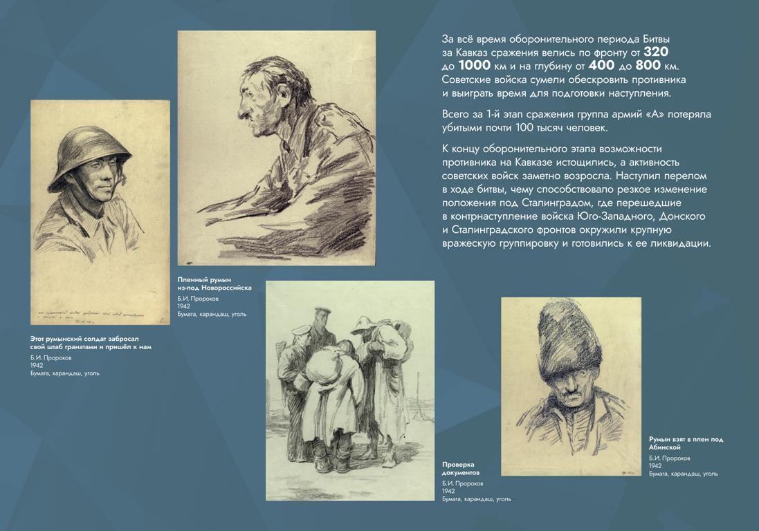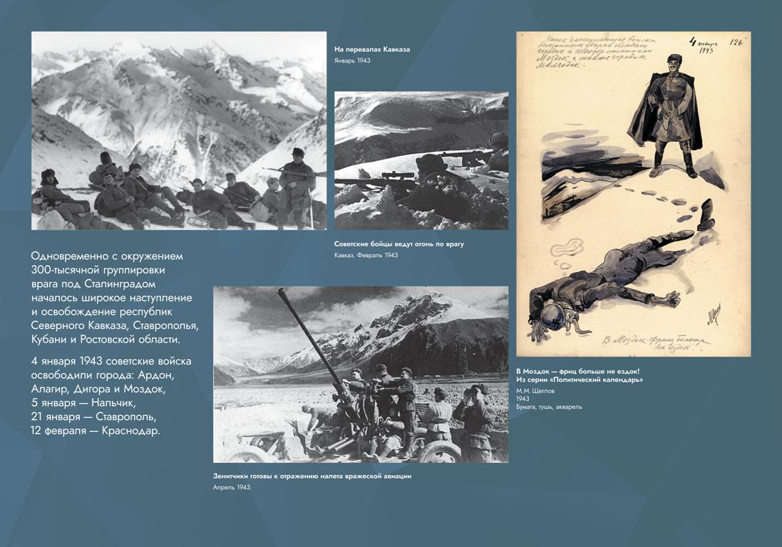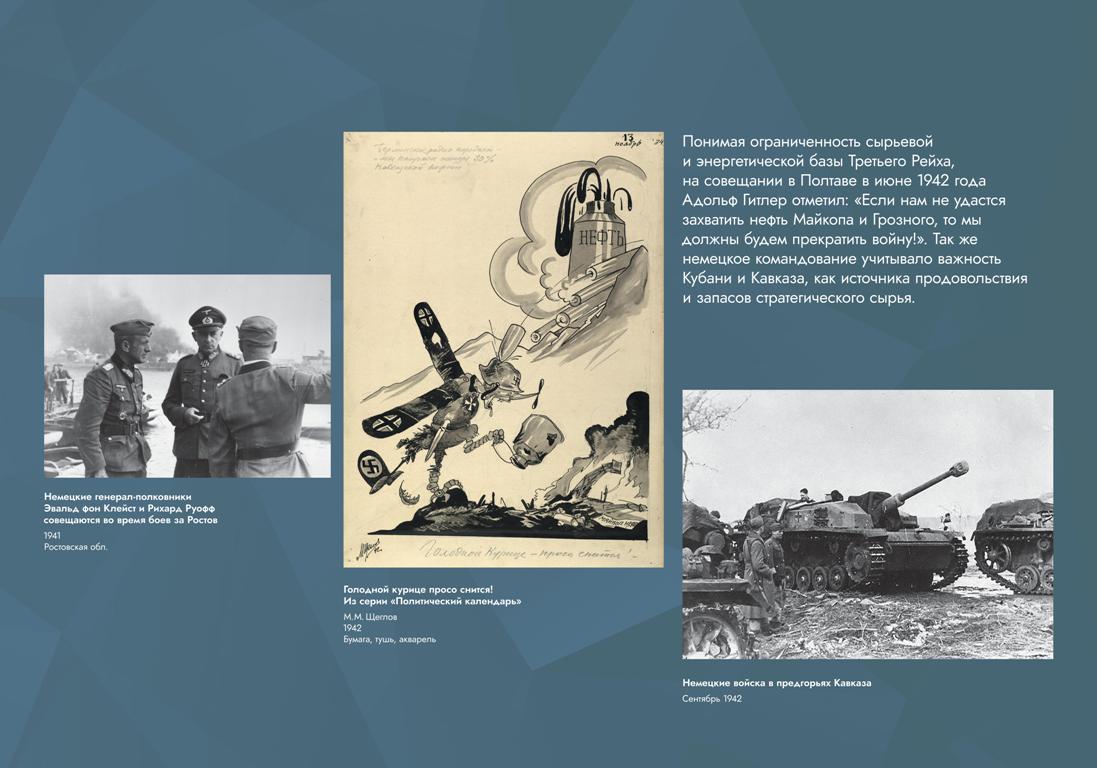 Выставка создана на основе фондовых экспонатов Музея Победы и рассказывает об одной из самых продолжительных и масштабных в истории Великой Отечественной войны битве за Кавказ с 25 июля 1942 по 9 октября 1943.