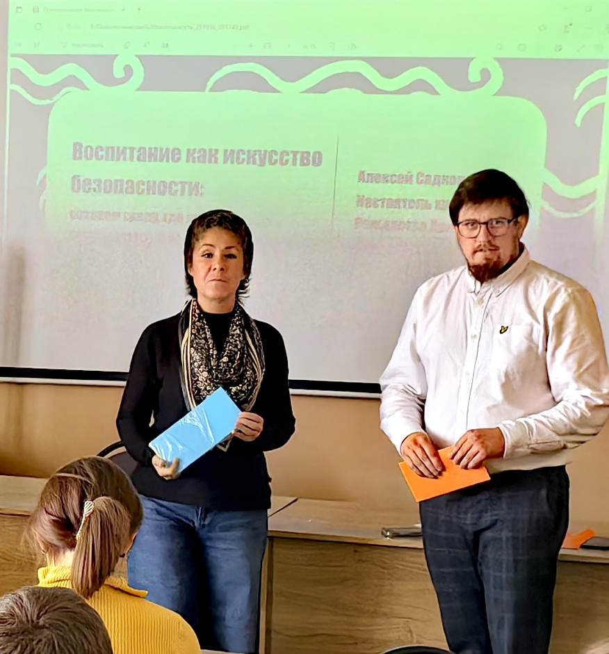 Иерей Алексей Алексеевич Садков, настоятель храма Рождества Христова с. Яковлево Заокского района, магистрант ТГПУ им. Л.Н. Толстого, и Каринэ Юрьевна Брешковская, кандидат педагогических наук, доцент кафедры психологии и педагогики факультета психологии ТГПУ им. Л.Н. Толстого организовали интерактивный воркшоп на тему: «Воспитание как искусство безопасности: создаем среду, где личность раскрывается, а не защищается», где участники решали кейсы, обменивались мнениями, отстаивали свои позиции по рассматриваемым вопросам.