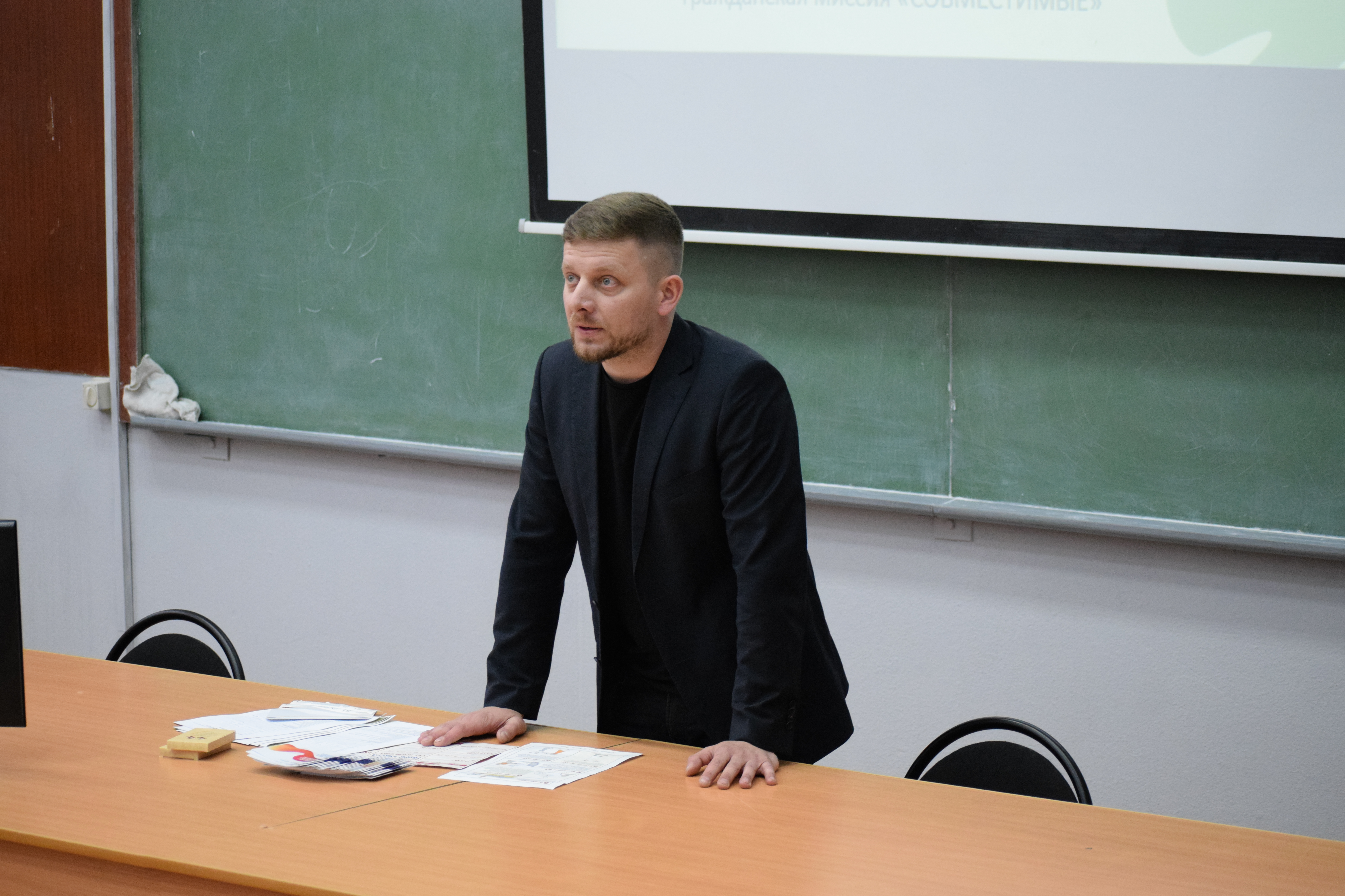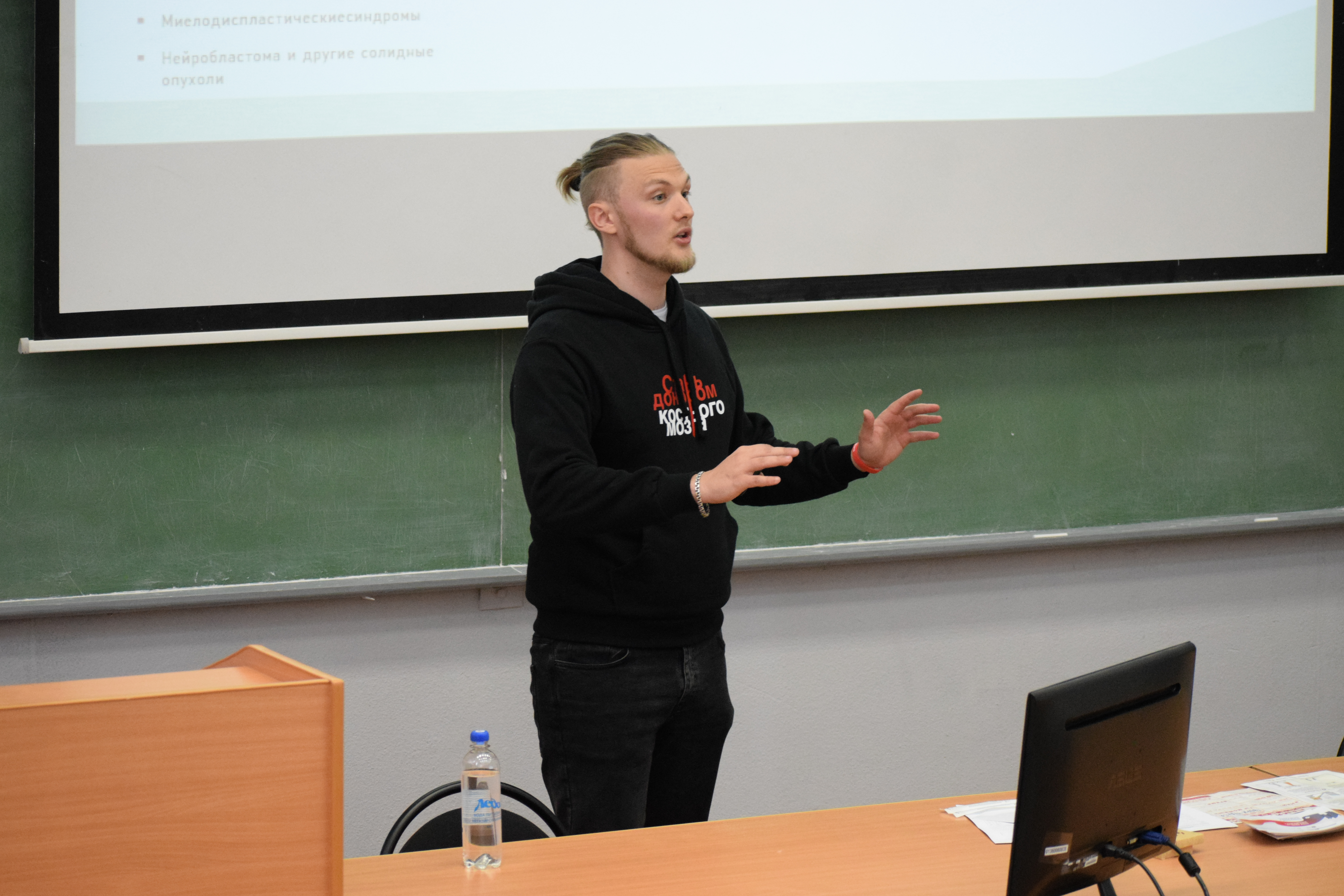 В качестве лектора выступил спикер проекта «Гражданская миссия «Совместимые» Юрий Николенко, координатор Национального регистра доноров костного мозга имени Васи Перевощикова.