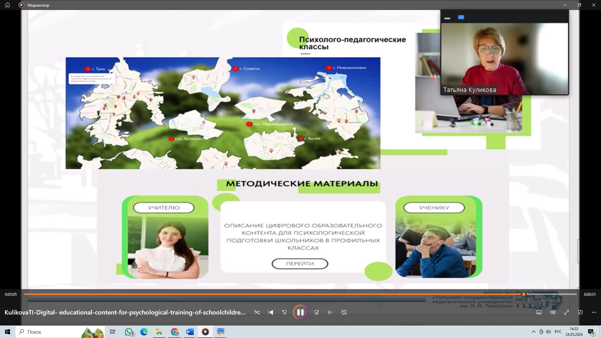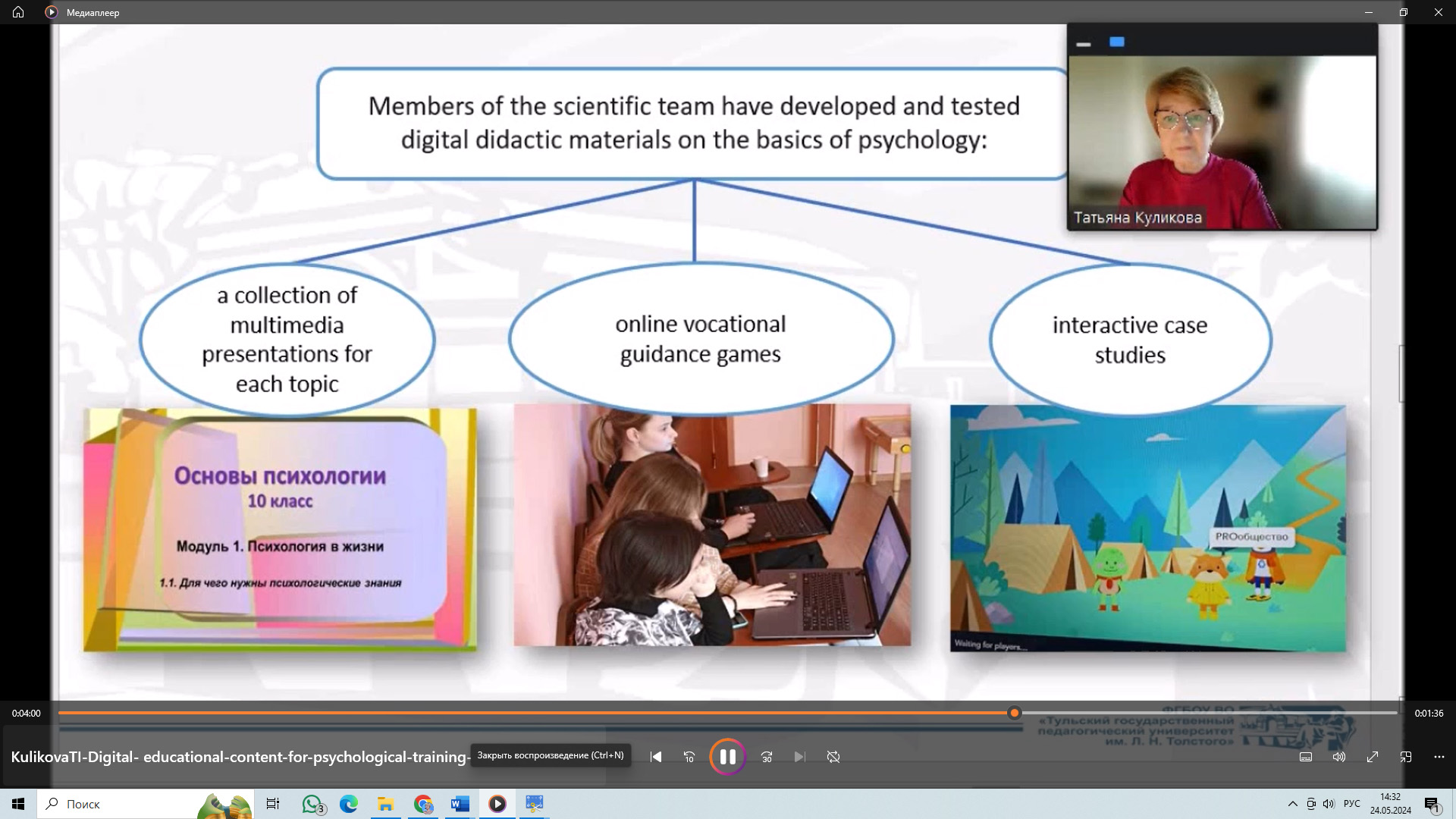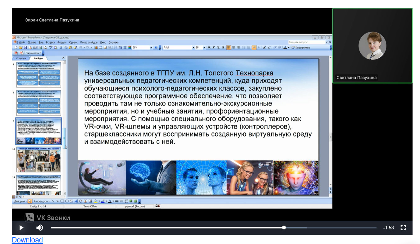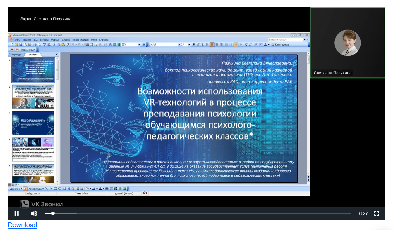 В форуме приняли участие заведующая кафедрой психологии и педагогики Светлана Вячеславовна Пазухина и доцент Татьяна Ивановна Куликова. В своих докладах «Возможности использования VR-технологий в процессе обучения психологии учащихся психолого-педагогических классов» и «Цифровой образовательный контент для психологической подготовки школьников в профильных классах» ученые представили промежуточные результаты работы научного коллектива Толстовского университета по выполнению госзадания Минпросвещения России по теме «Научно-методологические основы создания цифрового образовательного контента для психологической подготовки в педагогических классах (No 073-00033-24-01 от 09.02.2024).