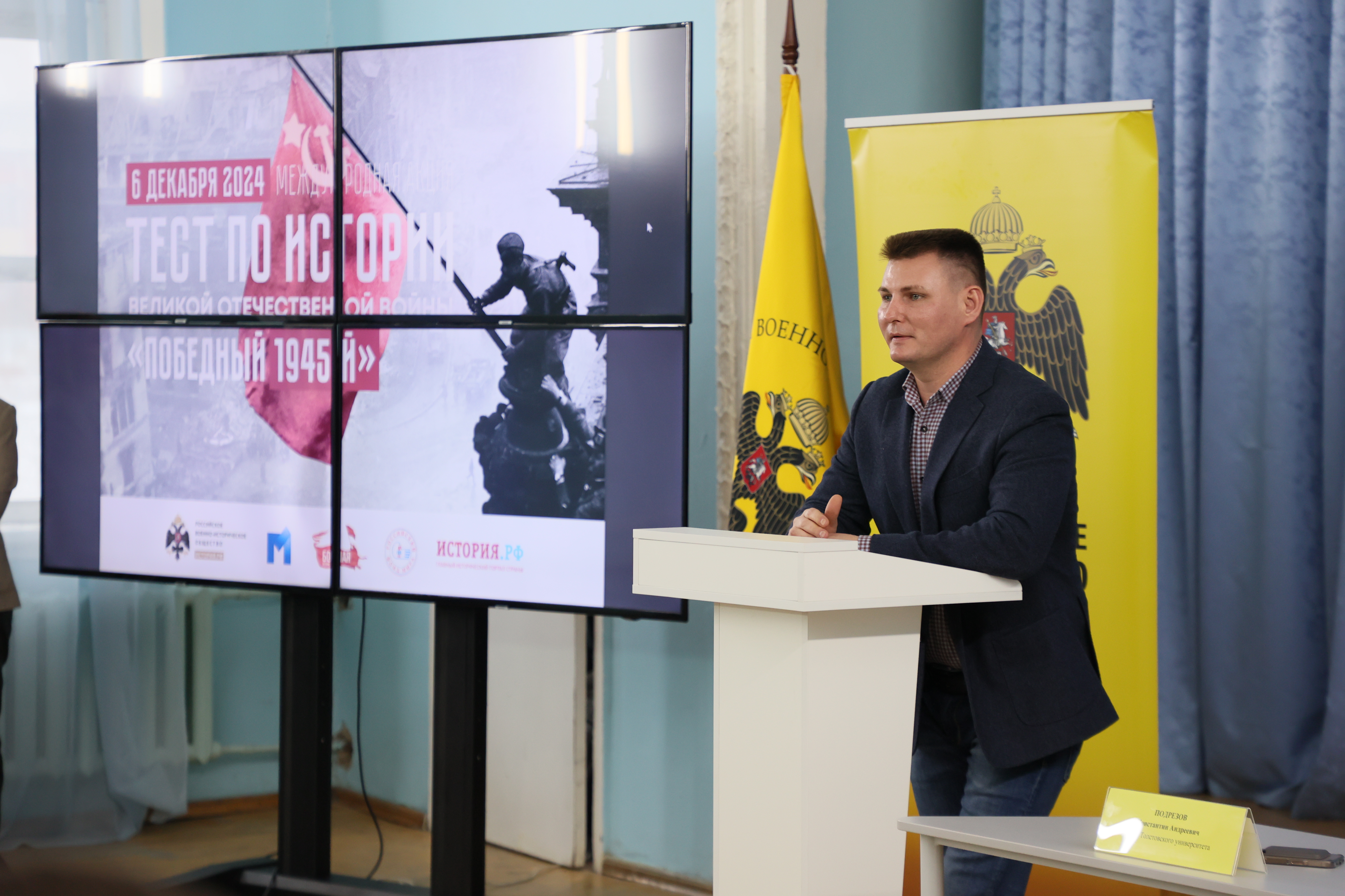 – Когда я поступил на исторический факультет, было очень модно подвергать сомнению истинность исторических фактов. В достаточно серьезных изданиях обсуждали теорию, согласно которой СССР напал на Германию, а не наоборот. К счастью, наш преподаватель Сергей Николаевич Сёмушкин быстро объяснил нам истинную цену таких статей. Вам предстоит непростой тест, но я хотел бы, чтобы вы отнеслись к нему не как к проверке знаний, а подумали, что значили события той войны для мирового порядка, вспомнили истории своих семей, подумали о своих ровесникам, которые трудились в тылу, шли в бой, умирали от ран, в том числе, и в этом здании... Я хотел бы, чтобы вы пронесли эту правду через всю жизнь, кто бы что ни говорил. От того, что вы будете её передавать своим детям, зависит очень многое, – подчеркнул Константин Подрезов.