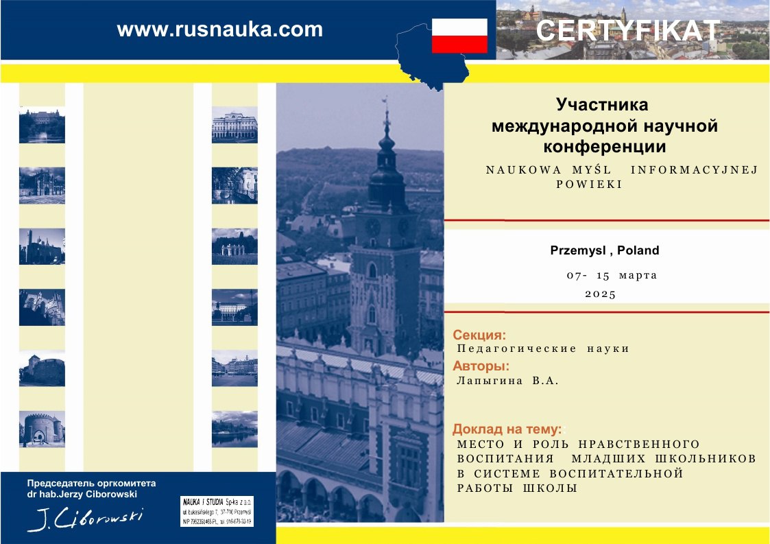 Под руководством профессора, доктора педагогических наук Владимира Романова она подготовила доклад и публикацию по теме: «Место и роль нравственного воспитания младших школьников в системе воспитательной работы школы».