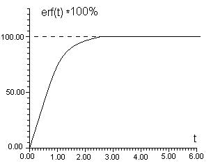 Этот интеграл называют функцией ошибок (или нормальным интегралом ошибок), который обозначается erf(t). Его значение при произвольном t аналитически не вычисляется и определяется только численными методами. В таблице 1 Приложения приведены значения функции ошибок для различных значений t. Вероятность может быть определена как в виде десятичной дроби, так и в процентах. На рис.7 изображена зависимость функции ошибок от параметра t в процентах.