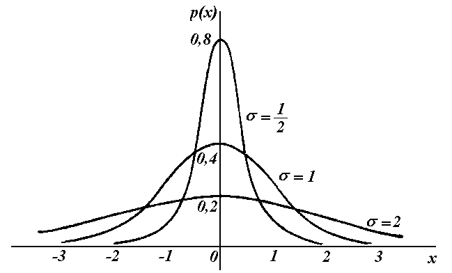 Функция p(x) достигает максимума при x = a, имеет точки перегиба при x = a ±s; ось абсцисс служит для нее асимптотой при x® ±¥. Для иллюстрации влияния параметра a на форму графика