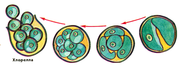 Хлорелла имеет вид микроскопического неподвижного шарика. Клетка одета плотной оболочкой, содержит чашевидный хроматофор. Размножается хлорелла бесполым путем, образуя множество (до 64) неподвижных спор. Входит в состав лишайников.