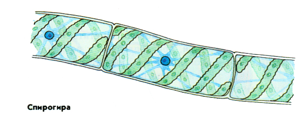 К зеленым нитчатым водорослям относится спирогира. Скопления этой водоросли на дне стоячих и медленно текучих водоемов образуют тину ярко –зеленого цвета. Хроматофор представляет собой спирально закрученную ленту (отсюда название). Вегетативное размножение осуществляется путем разрыва нити на короткие участки. Бесполое размножение отсутствует. Половое размножение осуществляется путем конъюгации – содержимое клетки одной особи перетекает в клетку другой особи, образуется зигота, дающая начало новой водоросли.