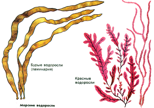 Отдел Красные водоросли, или Багрянки – одноклеточные и многоклеточные организмы размером от нескольких см до 1 м, обитающие в основном на дне морей. Набор определенных пигментов Багрянок позволяет им жить на большой глубине (100-200м) и поглощать немногочисленные лучи, доходящие до дна. Представители: порфира, филлофора, родимения, анфельция.