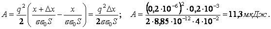 Определить работу, которую нужно совершить, чтобы увеличить на 0,200 мм расстояние между пластинами плоского конденсатора, заряженными разноименными зарядами с модулем q=0,200 мкКл. Площадь каждой пластины S=400 м2. В зазоре между пластинами воздух. (Сав.3.133)