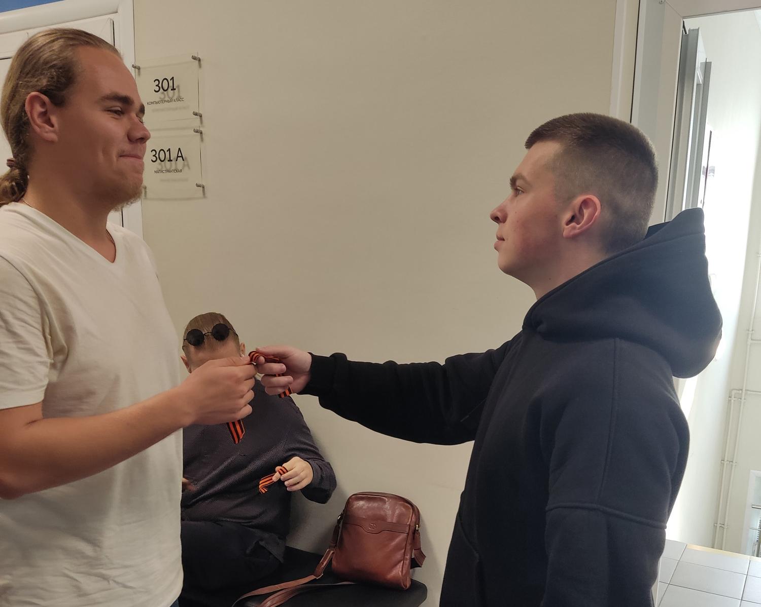 Утром, во всех учебных корпусах университета добровольцы организовали раздачу Георгиевских лент преподавателям, сотрудникам и студентам.