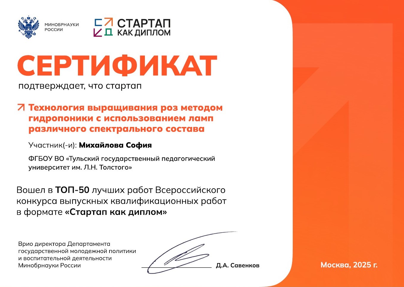 Студентка Университета Льва Толстого София Михайлова представила технологию выращивания роз методом гидропоники с использованием ламп различного спектрального состава.