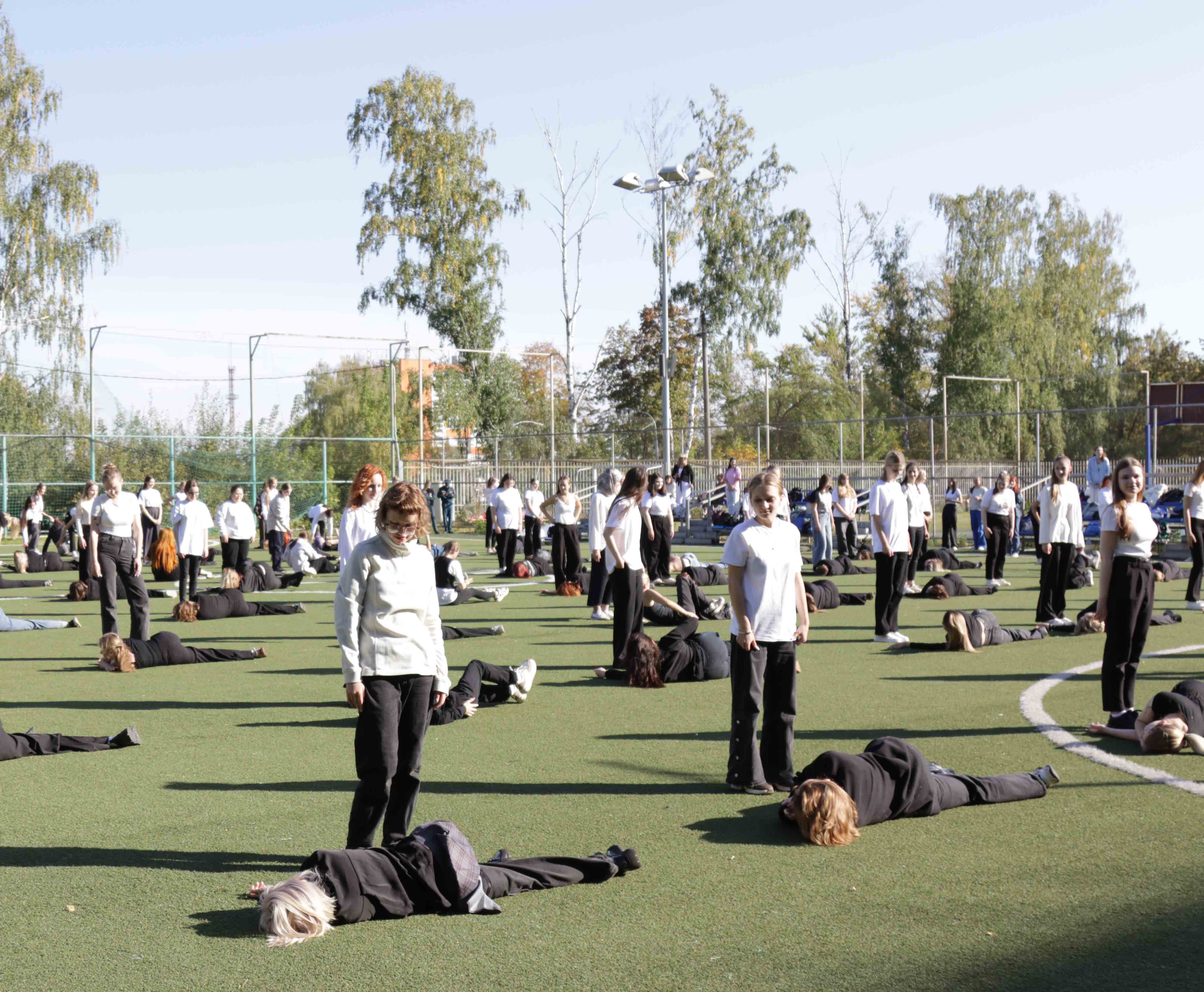 После обучающего этапа более 150 студентов и преподавателей Тульского педагогического под счет инструктора – сотрудника чрезвычайного ведомства одновременно выполнили поворот пострадавшего в устойчивое боковое положение.