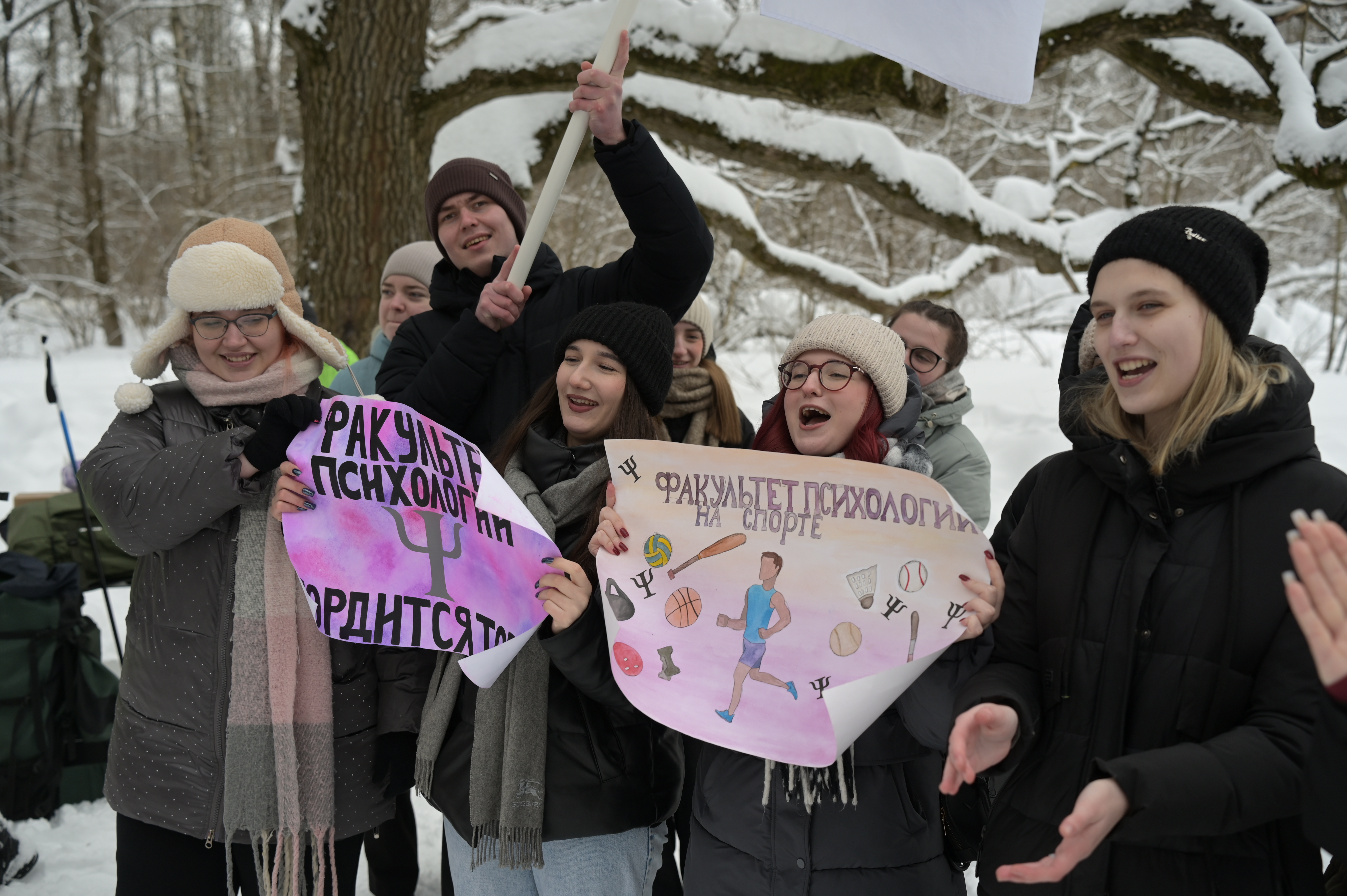 Группы поддержки факультетов и институтов ждали участников на финише с вкусной едой и ароматным чаем. Хорошее настроение усиливала игра в снежки.