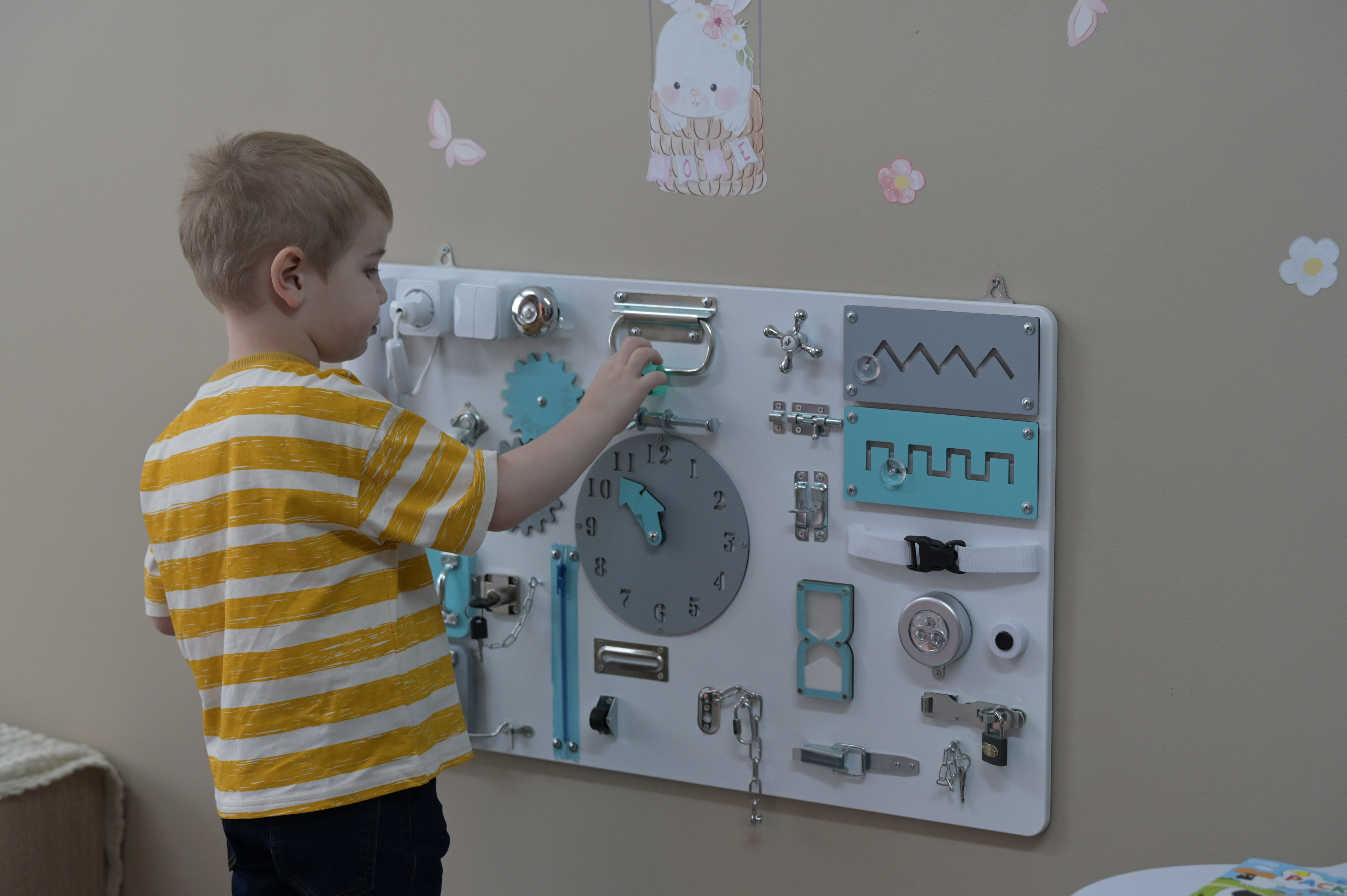 Первыми новую комнату по достоинству оценили четырехлетний Михаил и полуторогодовалая Алинка. И судя по тому, с каким удовольствием они занимались с бизибордом и пробовали румяные пирожки, комната пришлась им по душе.