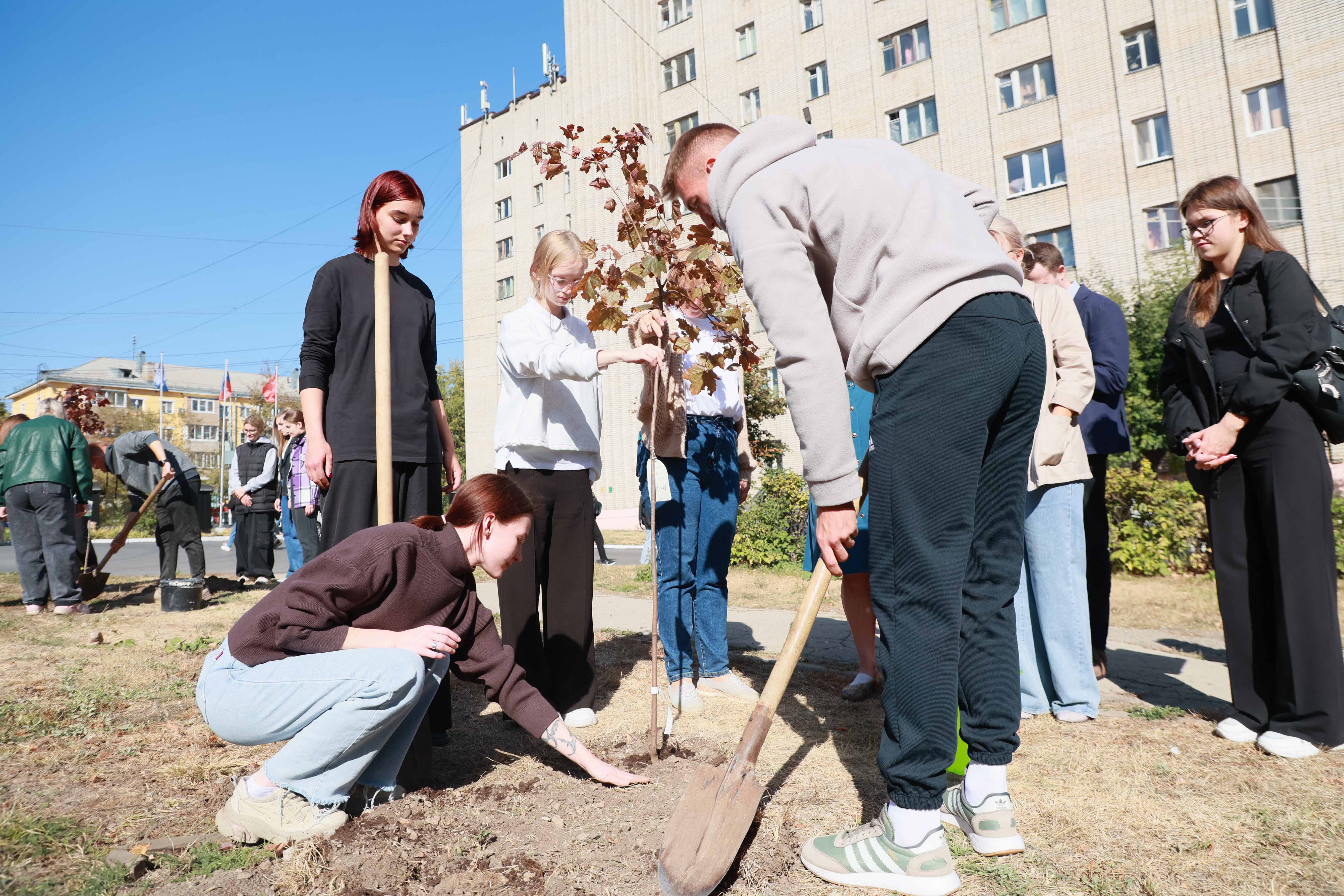 Три молодых клена посадили активисты факультетов и институтов университета. Каждый буквально прикоснулся к этому историческому событию.