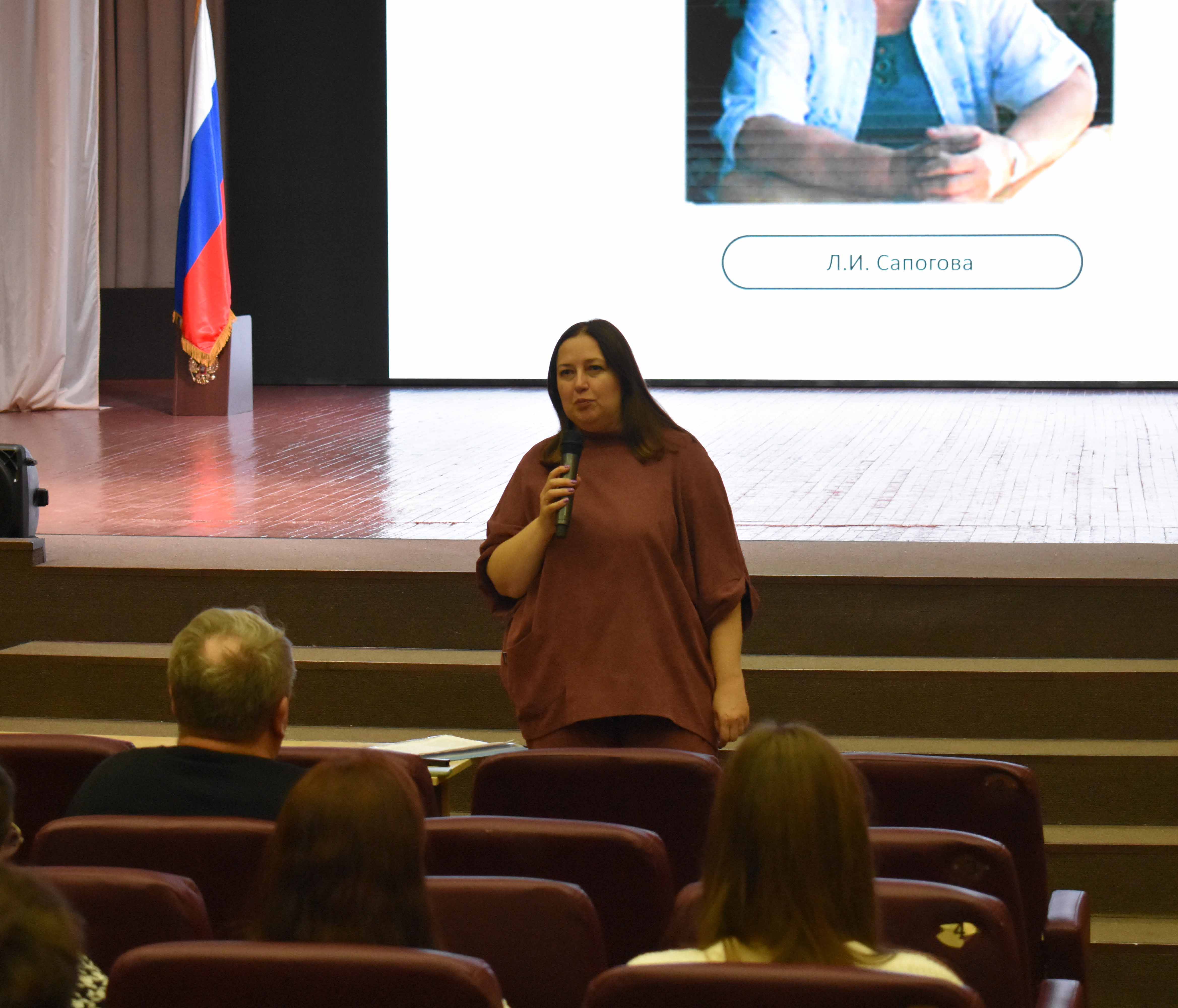 Декан факультета Дмитрий Александрович Разоренов рассказал о заслуженных педагогах и деканах факультета на протяжении его истории, а заведующая кафедрой романо-германской филологии Рязанцева Лариса Ивановна рассказала о профессиональном пути профессора Сапоговой Лидии Ивановны.