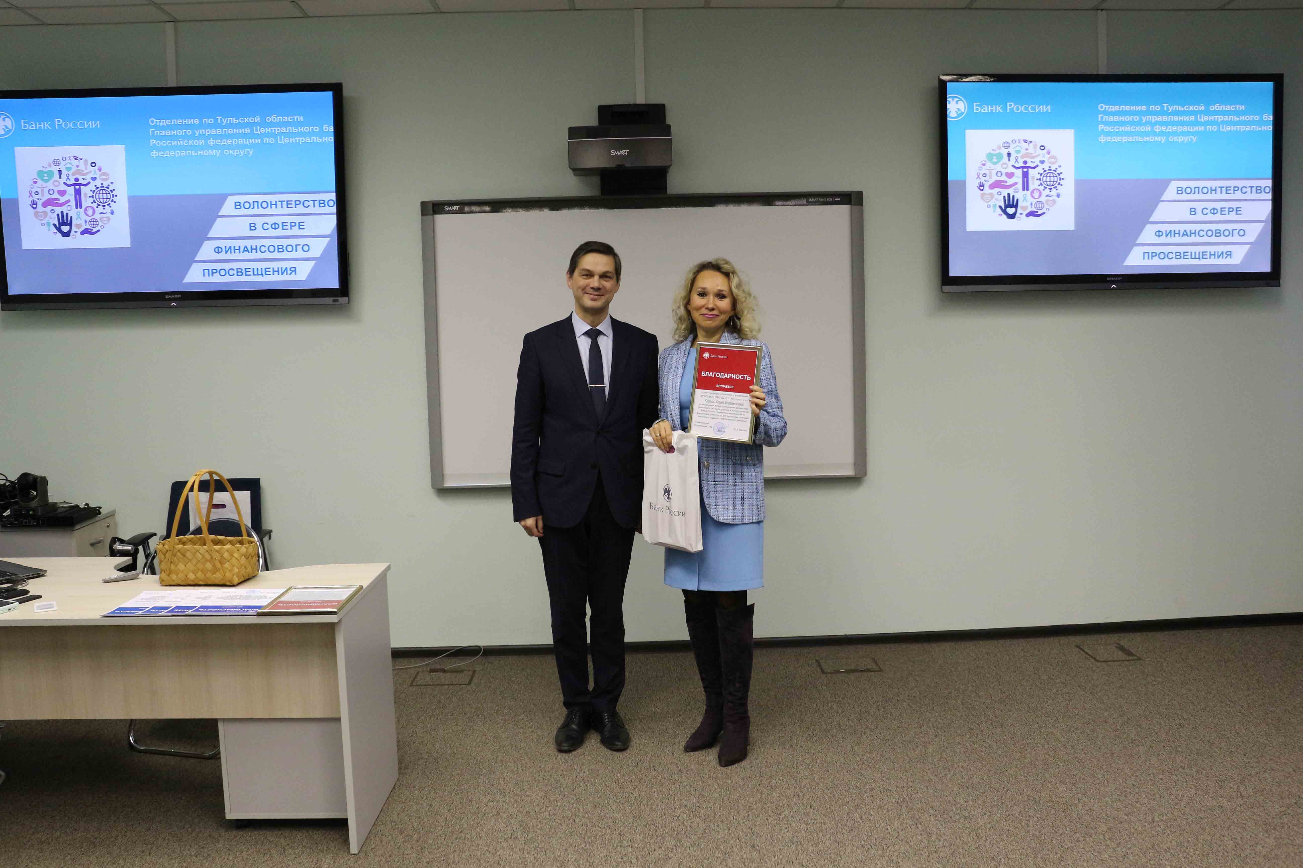 27 декабря в Отделении по Тульской области Главного управления Центрального банка РФ по ЦФО состоялось торжественное награждение финансовых волонтеров из числа студентов высших учебных заведений Тулы и их руководителей с участием управляющей Отделением Васиной Юнэссой Алексеевной, заместителем управляющего Отделением Борискиным Дмитрием Валерьевичем, а также начальниками отделов Отделения.