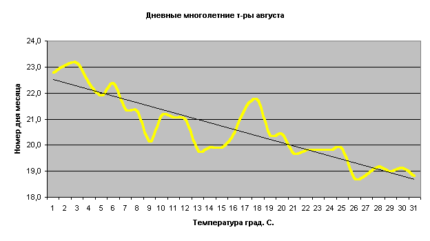Посследний летний месяц август характеризуется тем, что в районе 2 августа (Илья) наступает перелом температурного режима. С этого дня вместо более-менее плавного роста температуры, начинается ее непрерывное понижение и продолжается это до последних зимой власьевских морозов (24 февраля). За месяц дневная температура уменьшается на 4 градуса и становится к его концу равной 19 градусам (среднесуточной - меньше +15). В это время просходят взлеты и падения температуры. В среднем 18 августа наблюдается последний жаркий день, но если повезет, то еще такие же дни можно встретить в начале сентября в период "молодого бабьего лета". Первые заморозки на почве, как следует из вышеприведенной таблицы, в более половины случаев наступают в августе, нередко в самом его начале.