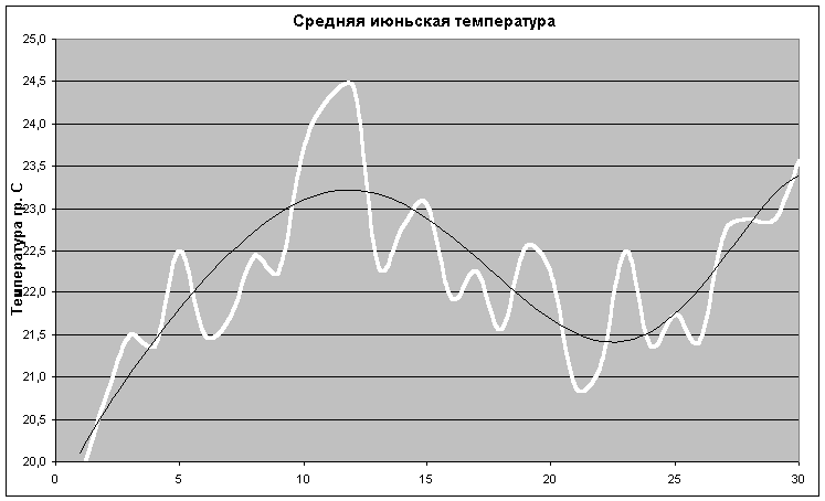 Следующий график дает общее представление о нашем лете. В частности видим, что в начале лета (31 мая и 1 июня) отмечаются сильные колебания температуры. Есть характерные июньские холода (средний срок 21 июня), тесно связанные с фазами Луны. Самый жаркий период лета наблюдается с 28 июня по 3 августа. Максимальные температуры лета приходятся в среднем на 15 июля. В конце самого жаркого периода лета (конец июля) наблюдается сильный подьем температуры, который вскоре меняется на такой же сильный его спад. И, наконец, в конце лета (средний срок 18 августа) мы видим последний всплеск летнего тепла. Лето в наших краях кончается в среднем 25 августа, когда резко меняется температурный режим. В это время начинаются первые заморозки на почве, дачники начинают копать картошку, появляются первые желтые листья на деревьях. Перейдем к более детальному рассмотрению характера лета. Начнем с первого месяца лета - июня. ИЮНЬВот как пишет про июнь А. Стрижев в своей книге "Календарь русской