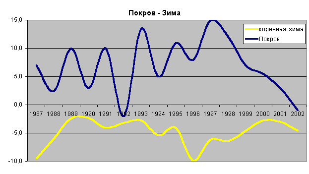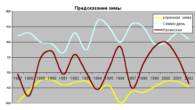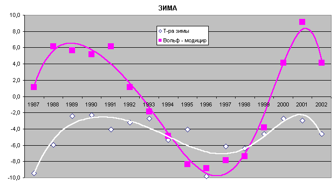Из графика видно, что есть некоторая периодичность в сроках наступления данного сезона. Раз в 2-3 года повторяются её ранние (или поздние) сроки. О продолжительности зимы и её странной связи с продолжительностью весны сказано в главе "Весна". Очень трудно предсказать предстоящую зиму, не помогают народные приметы. Зима своенравна и плохо поддается нашим прогнозам. Но кое-какие прогнозы все же возможны. Посмотрите на график. Здесь приведены значения температуры зимы и активности Солнца (коэффицент Вольфа, модифицированный, для удобства представления). ![]()