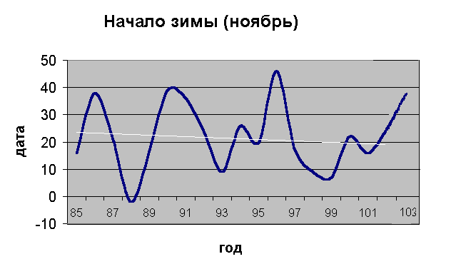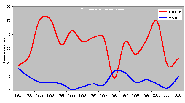 Если морозы для зимы естественны, то слышать о многочисленных оттепелях зимы, наверное странно. И все же, как говорилось выше в разделе о снеге, оттепелей за зиму в среднем 35, т.е. каждый третий день. Бывают зимы холодные, а чаще, в последние годы - умеренные и теплые. Посмотрите на графики (дата года - дата начала зимы).