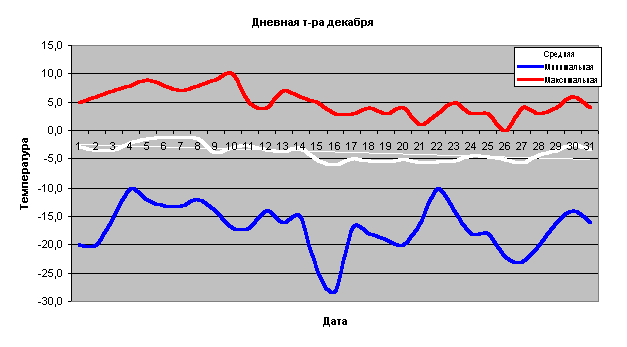 Первый месяц календарной зимы может нас порадовать настоящими морозами. Из графика, помещенного выше, видим, что это событие возможно 1, 16, 27 декабря, при этом дневная температура может достигать значений -30. Оттепели в декабре вероятны в периоды 4-10 и 30 декабря. Напомню, что по народным приметам "Введение (4 декабря) ломает ледение". Многолетняя средняя дневная температура декабря около -40С и уменьшается за месяц с -2 до -5 градусов. Возможный размах дневной температуры декабря 40 градусов, от +10 до -30.