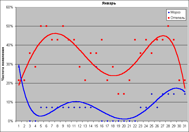 Даже такой самый холодный зимний месяц, как январь, редко обходится без оттепелей. Посмотрите на график, где приводится частота оттепелей и морозов на каждый день января (данные за 14 лет наблюдения). В среднем в январе выпадает 2,5 морозных дня и 11 дней с положительной температурой.