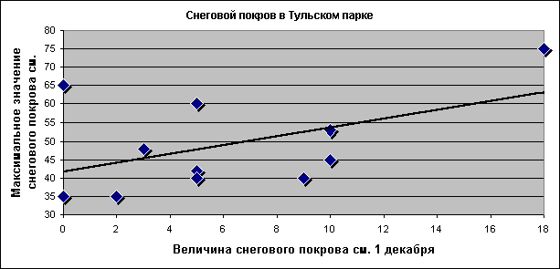 Видно, что графики похожи, или, как говорят ученые - подобны. Это означает, что в годы активного Солнца вероятнее всего ожидать теплых зим, а в годы спокойного - холодных. Знаменитый "Покров" неважно работает, как предсказатель зимы, лучше обратить внимание на "Зимнюю Казанскую", 4 ноября. Интересен для прогноза зимы и "Семен-день", 14 сентября. ![]() ![]() ![]() О снегеМы немыслим зиму без снега и поэтому поговорим о том, сколько снега выпадает в Туле, в какие сроки, сколько времени он "живет" на нашей земле, когда "рождается" и "умирает". Начнем с того, что определимся, какой высоты достигает снежный покров в нашу зиму. Для этого заглянем в наш любимый городской парк им. П.П. Белоусова. Высота снежного покрова в Тульском парке