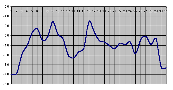 На приведенном выше графике можно увидеть как причудливо ведет себя дневная температура в течение месяца (приводятся средние многолетние данные). Можно выделить четыре самых холодных периода - 1, 13, 25, 31 января и три теплых - 6, 9 и 16 января. Самое холодное время января, зимы и всего года - это морозы в начале и конце месяца - Васильевские и Афанасьевские морозы.