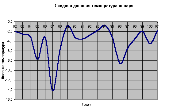 На следующем графике можно увидеть, как менялась температура месяца от года к году. Видно, что январь в последние годы становится все теплее и морозы зимы вроде зимы 1986/87 года становятся легендой.