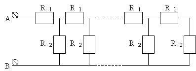 5.На рисунке изображена бесконечная цепь, образованная повторением одного и того же звена, состоящего из сопротивлений R1=2,00 Ом, R2=4,00 Ом. Найти сопротивление этой цепи.(Сав.3.137)(Ц.18.15)